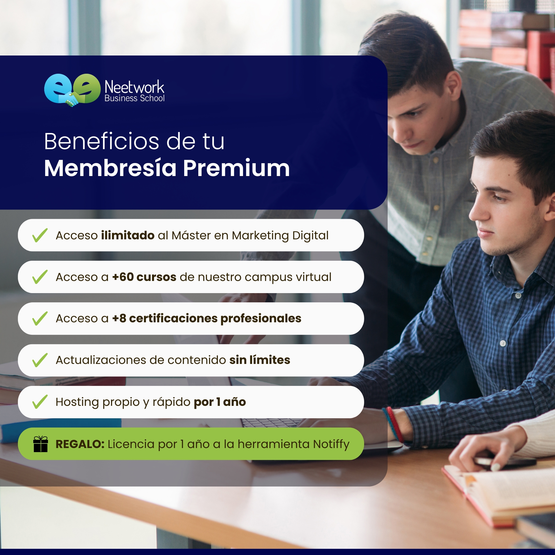 Obtén los conocimientos y la experiencia práctica para crear negocios online rentables, multiplicar tu productividad con inteligencia artificial y abrirte camino en las profesiones digitales más demandadas del momento.